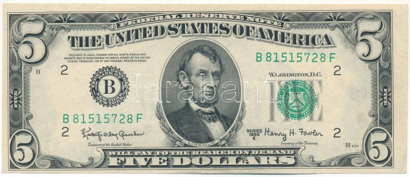 USA 1965-1966 (1950E) 5 Dollars "Federal Reserve Note" green seal "Kathryn O'Hay Granahan - Henry Hamill Fowler" C:F fine paper