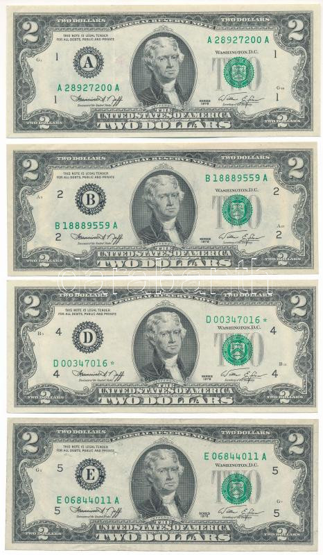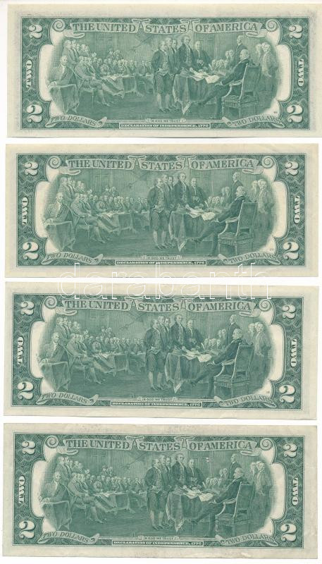 Amerikai Egyesült Államok 1976. 2$ "Federeal Reserve Note" zöld pecsét, "Francine Irving Neff - William E. Simon" (4db, mind más városban kiadva: Boston, New York, Cleveland, Richmond) T:F,VG közte szép papír USA 1976. 2 Dollars "Federal Reserve Note" green seal, "Francine Irving Neff - William E. Simon" (4pcs, all from different cities: Boston, New York, Cleveland, Richmond) C:F,VG within fine paper Krause P#461