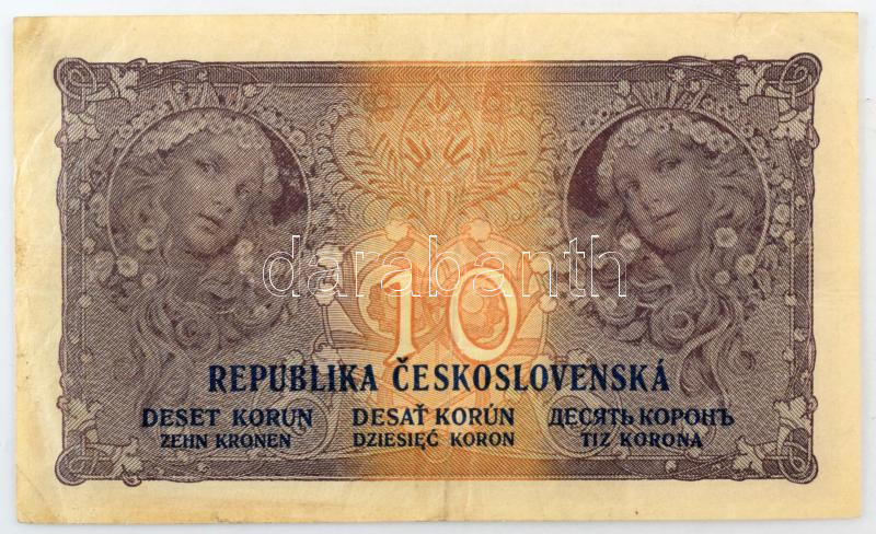 Czechoslovakia 1919. 10 Korun "O 137 654778" C:F upper left corner with ~4mm long tear