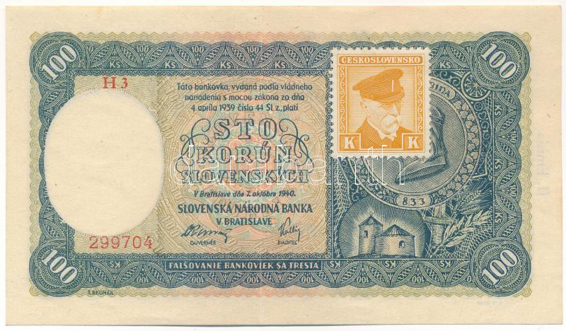 Czechoslovakia 1945. (1940) 100 Korun "K" stamp, 2nd issue, "H3 299704" C:XF