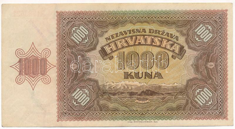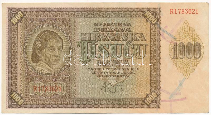 Beschreibung: Horvátország / Független Horvát Állam 1941. 1000K "R" T:F szép papír Independent State of Croatia 1941. 1000 Kuna "R" C:F fine paper