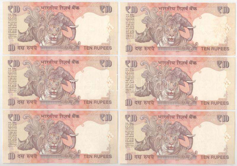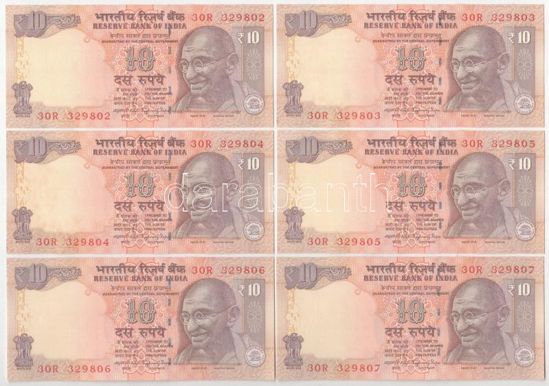 India 2014. 10R (6x) sorszámkövetők "30R 329802 - 30R 329807"... https://www.darabanth.com/de/472-Fernauktion/472.0/Numismatik/Weltweit-Banknoten~2000016/India-2014-10R-6x-sorszamkovetok-30R-329802-30R-329807-TUNC-India-2014-10-Rupees-6x-co~II3198611