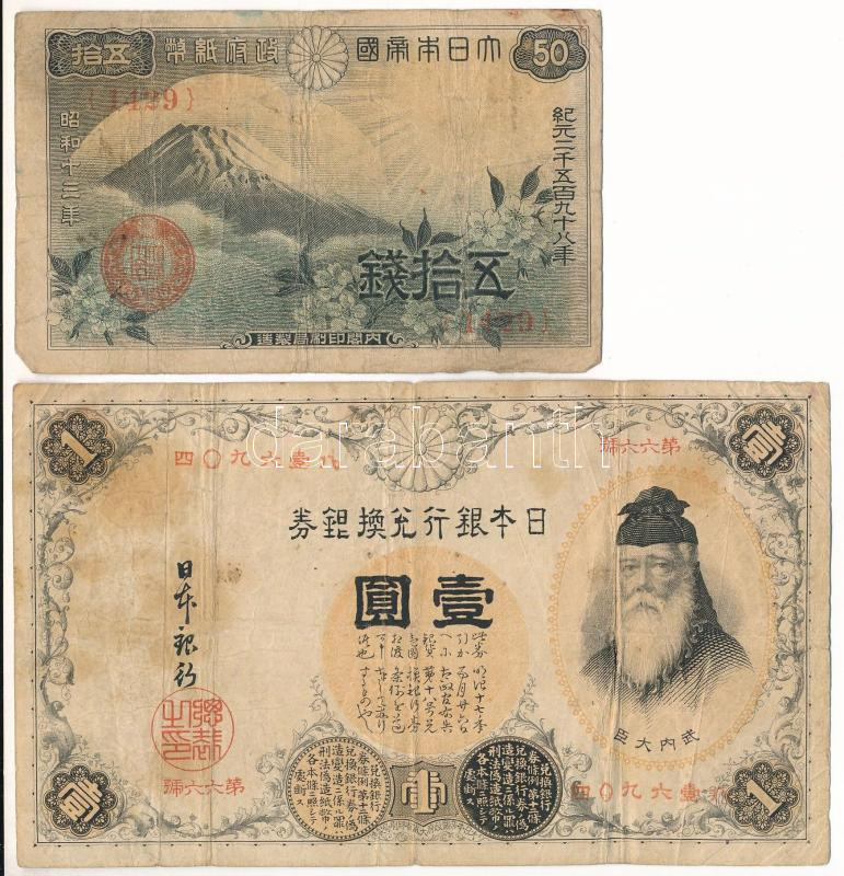 Japán 1916. 1Y + 1938. 50s T:VG Japan 1916. 1 Yen + 1938. 50 Sen C:VG ... https://www.darabanth.com/de/472-Fernauktion/472.0/Numismatik/Weltweit-Banknoten~2000016/Japan-1916-1Y-plus-1938-50s-TVG-Japan-1916-1-Yen-plus-1938-50-Sen-CVG-Krause-P2330-P2358~II3199826