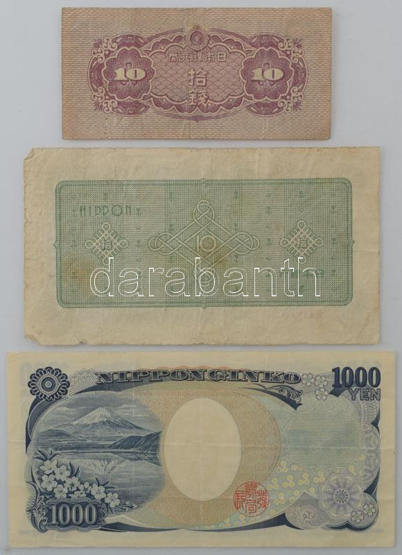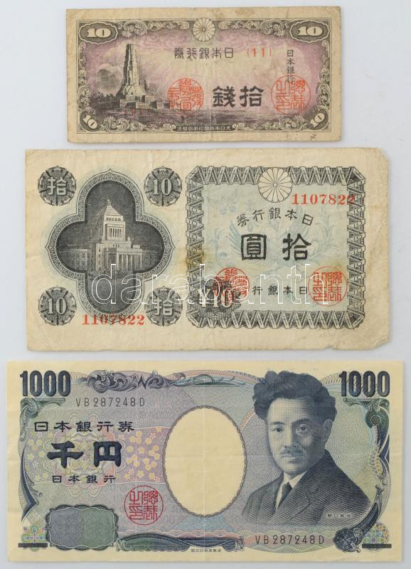 Japán 1944. 10s + 1946. 10Y + 2004-2011. 1000Y T:F,VG közte szép papír