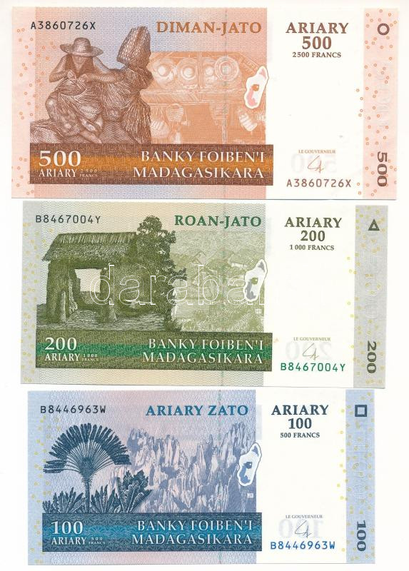 Madagascar 2004. 100 Ari... https://www.darabanth.com/de/472-Fernauktion/472.0/Numismatik/Weltweit-Banknoten~2000016/Madagaszkar-2004-100A-500A-3xklf-TUNC-VF-Madagascar-2004-100-Ariary-500-Ariary-3xdiff-CU~II3201066