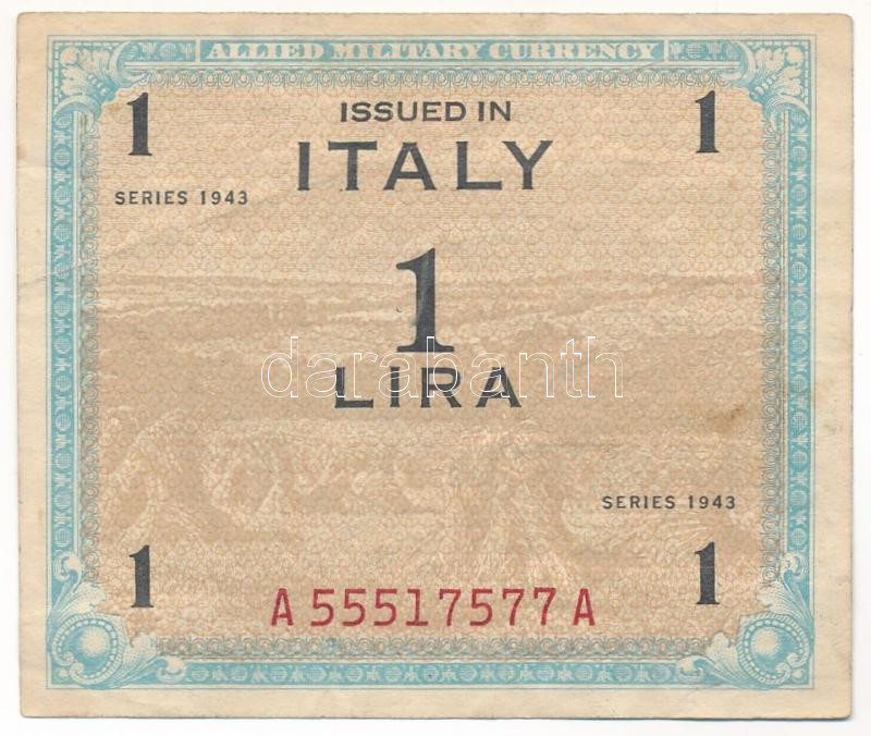 Olaszország / Szövetséges megszállás 1943. 1L "F" nyomdai je... https://www.darabanth.com/de/472-Fernauktion/472.0/Numismatik/Weltweit-Banknoten~2000016/Olaszorszag-Szovetseges-megszallas-1943-1L-F-nyomdai-jelzessel-TF-Italy-Allied-Occupa~II3195882