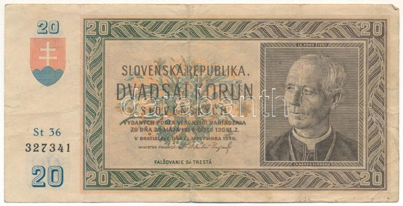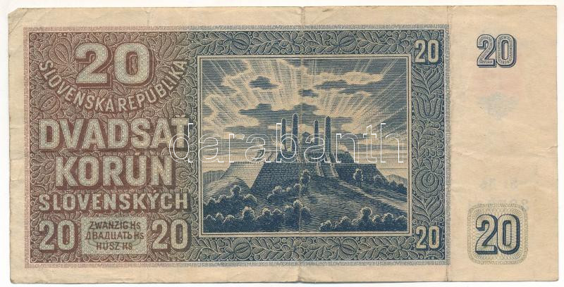 Szlovákia 1939. 20K T:F Slovakia 1939. 20 Korun C:F Krause P#5 https://www.darabanth.com/de/472-Fernauktion/472.0/Numismatik/Weltweit-Banknoten~2000016/Szlovakia-1939-20K-TF-Slovakia-1939-20-Korun-CF-Krause-P235~II3202642