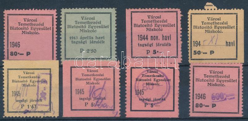 Beschreibung: 1944 Városi temetkezési biztosító egylet Miskolc 8 db klf tagsági bélyeg