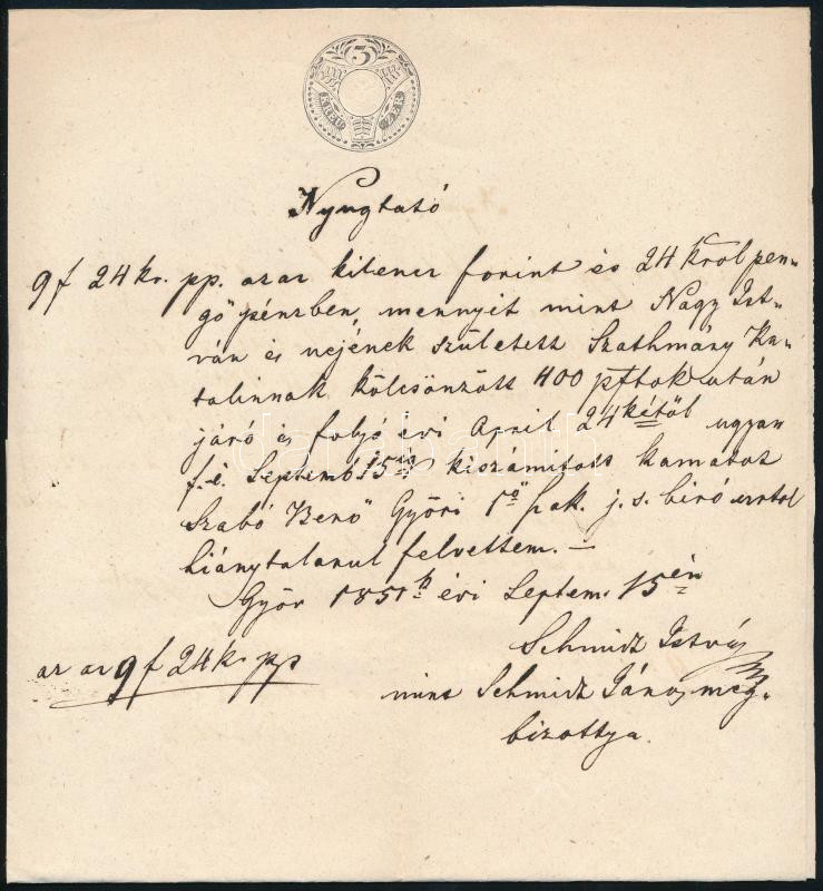 Beschreibung: 1851 Győr, elismervény 3kr szignettával