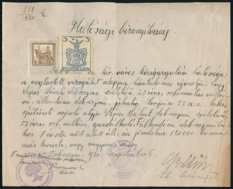 Beschreibung: 1920 Debrecen, hatósági bizonyítvány 3K városi 2 K állami illetékbélyeggel