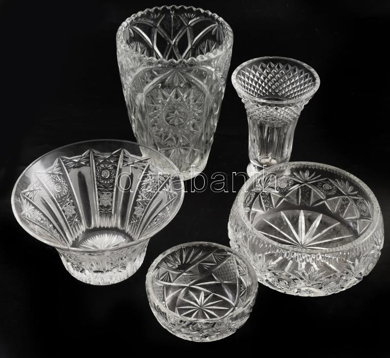 Beschreibung: 5 darab ólomkristály tárgy, vázák, kínálók, d: 19 cm alatt, m: 20 cm alatt