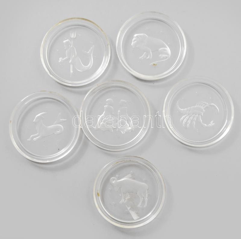 6 db klf állatfigurás üveg poháralátét. Csiszolt. hibátlan d: 9 cm https://www.darabanth.com/de/472-Fernauktion/472.0/Porzellan-Keramik-Glass/Glaser~1000008/6-db-klf-allatfiguras-uveg-poharalatet-Csiszolt-hibatlan-d-9-cm~II3147875