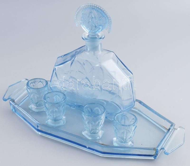 Art deco kéküveg likőrös szett, 4 pohárral, pattogzással. https://www.darabanth.com/de/472-Fernauktion/472.0/Porzellan-Keramik-Glass/Glaser~1000008/Art-deco-kekuveg-likoros-szett-4-poharral-pattogzassal~II3194468