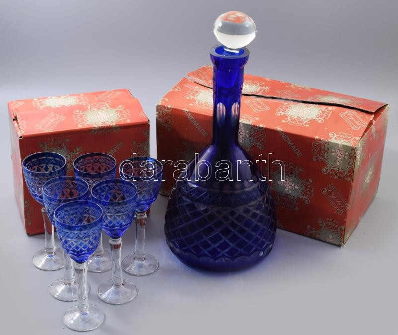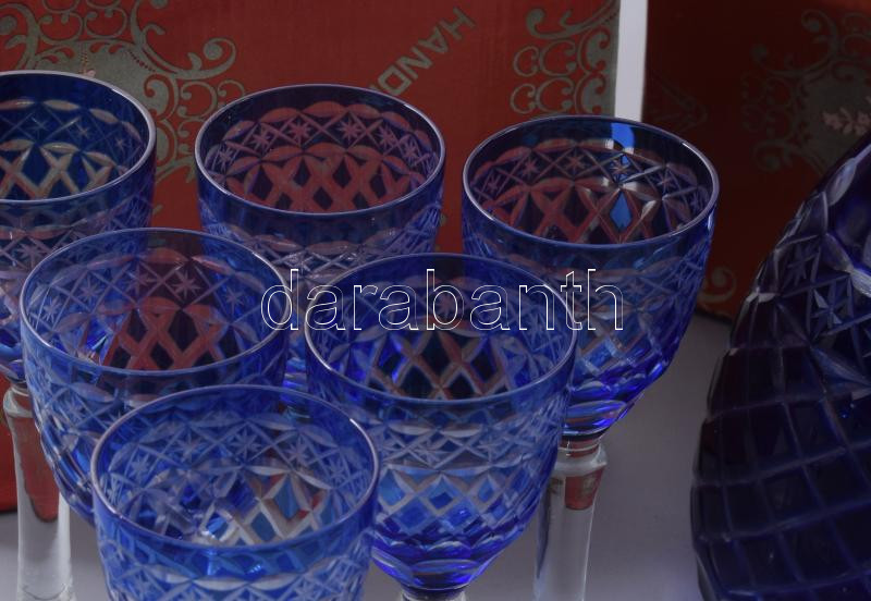 Beschreibung: Dúsan csiszolt kristály kék likőrszervírozó készlet. Dugós italos üveg m: 33,5 cm, és 6 darab pohár m: 15,5 cm. Hibátlan, eredeti dobozában.