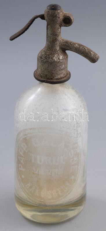 Beschreibung: Papp Balázsné Rákoshegy Turul Szikvízgyár szódásüveg, korrodált fejjel, m: 27 cm