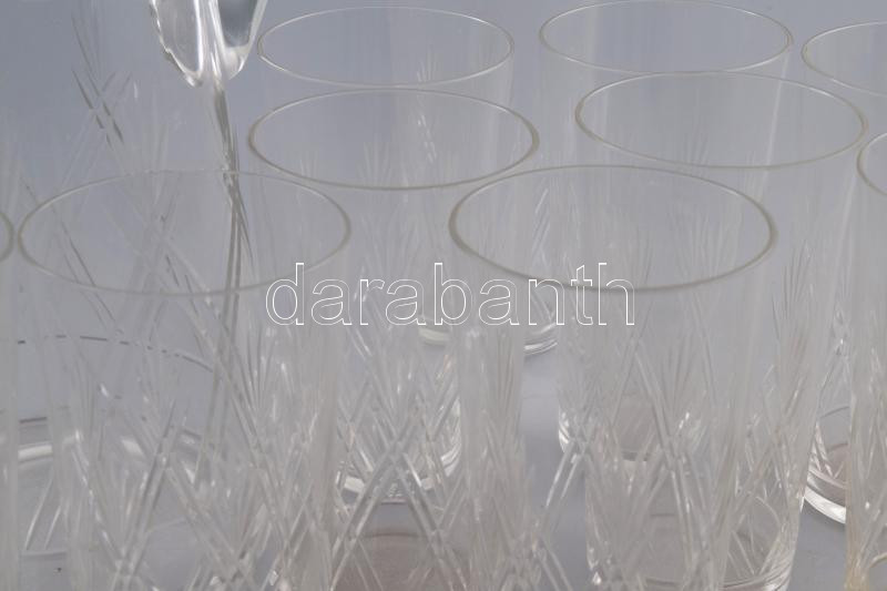 Beschreibung: Vizes kancsó 10 pohárral, Metszett üveg, hibátlan 30 cm, 13 cm