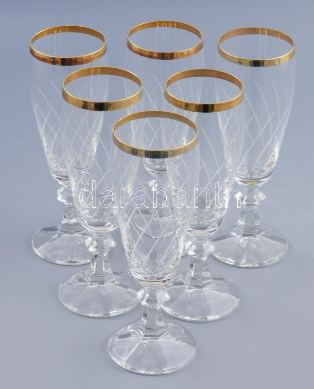 Beschreibung: cca 1950, Francia kristály champagne pohár szett, 6 darab, köszörült vonalmintával, aranyozott szájrésszel, m: 17,5 cm
