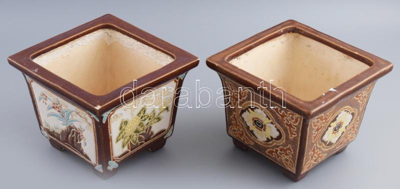 Beschreibung: 2 db kínai kaspó. Samottos kerámia, jelzett, hajszálrepedésekkel. 18x18 cm