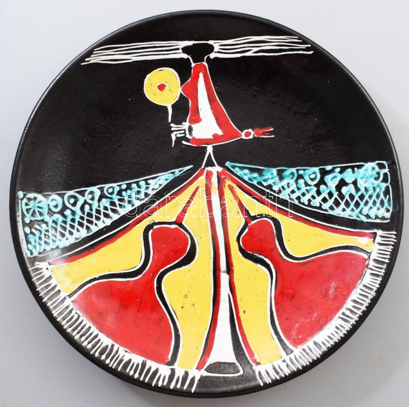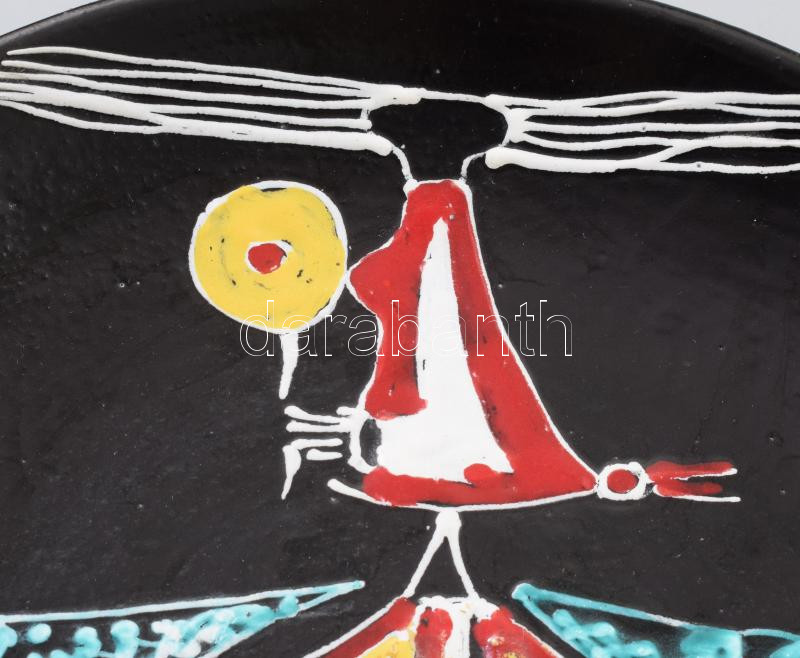 Beschreibung: Holló Katalin által készített dísztányér álomszerű jelenettel díszítve, jelzett, hibátlan, d: 29,5 cm