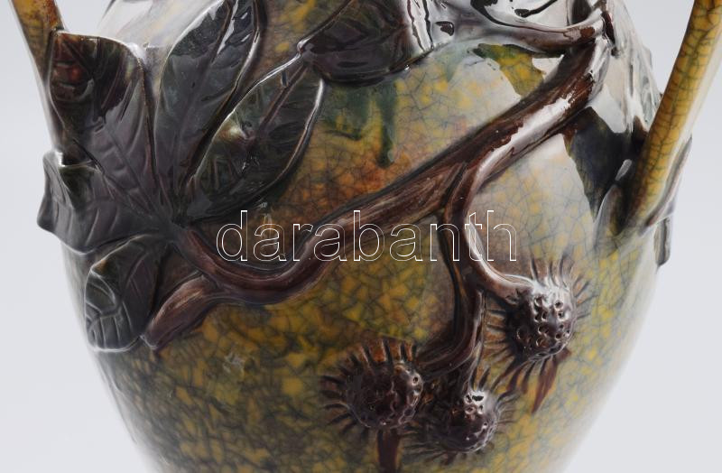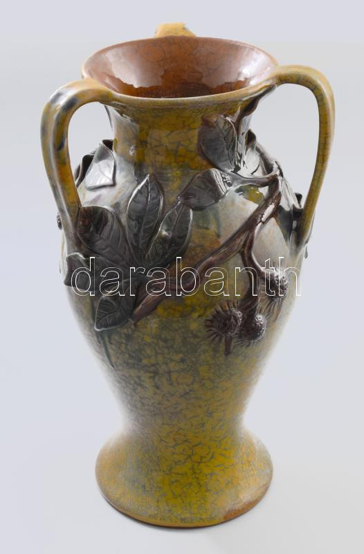 Plasztikus növénymotívumokkal díszített iparművész padlóváza. Képcsarnokos címkével, m: 42,5 cm /// SZEMÉLYES ÁTVÉTEL, NEM POSTÁZZUK / ONLY PERSONAL COLLECTION IN OUR OFFICE!