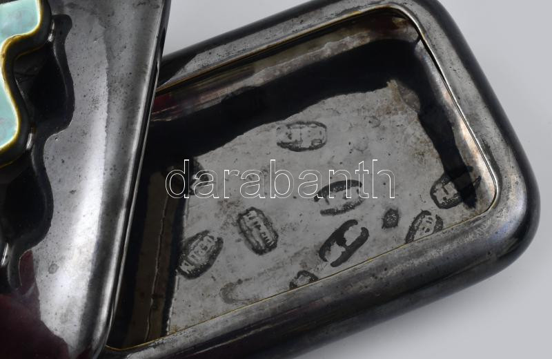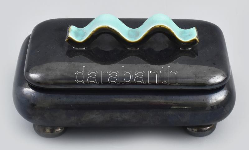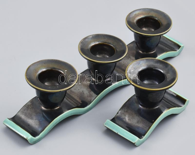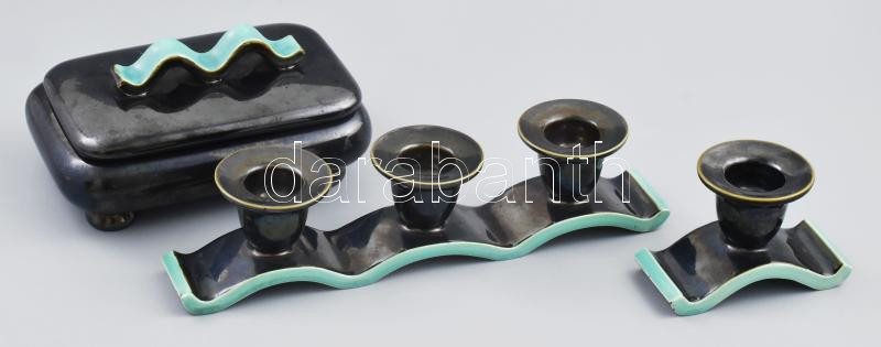 Zsolnay - Gádor István és Gorka Géza által tervezett asztali készlet. Háromágú és egyágú gyertyatartó, asztali dobozka fekete és türkiz fedőmázakkal. Jelzés nélkül, hibátlan 12 cm, 31 cm, 20x14 cm Készültek 1930 körül a budapesti Zsolnay gyárban. Hasonló darabok az iparművészeti múzeum gyűjteményében szerepelnek: