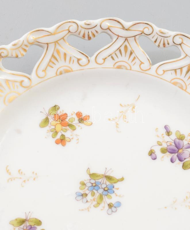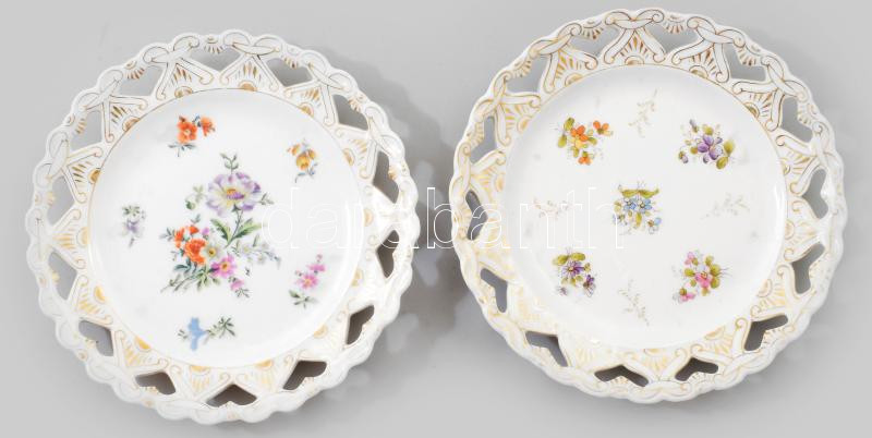 Beschreibung: 2 db kézzel festett áttört porcelán tányér jelzés nélkül, kopással d: 16 cm