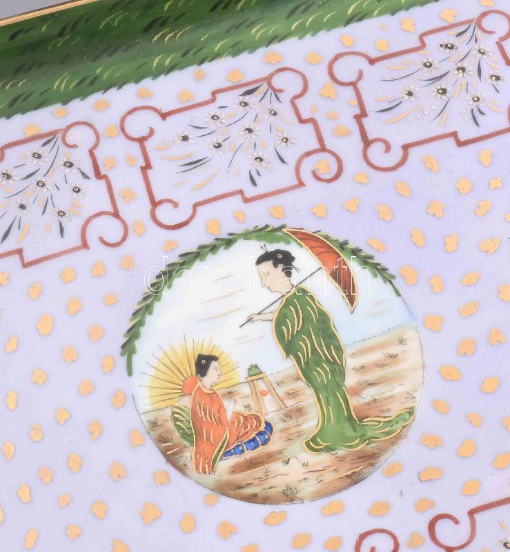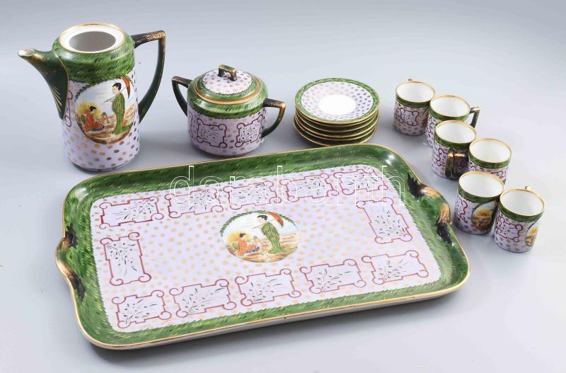 Beschreibung: Antik kínai mokkás szett, tálcán. Tejkiöntő és egy fedél hiányzik, egyik csészén repedéssel.