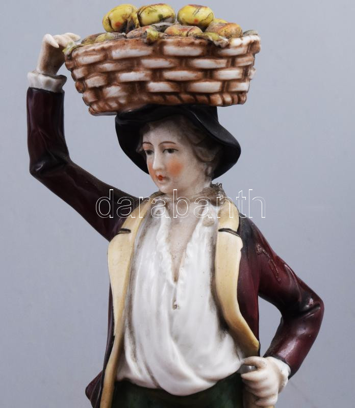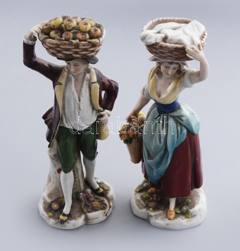 Beschreibung: Capodimonte gyümölcshordó és ruhahordó figura pár, jelzett, férfi nyaka ragasztott, kis sérülésekkel, m: 16 cm