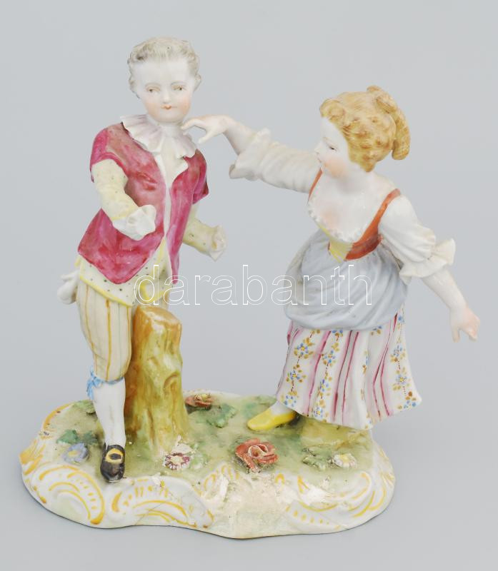 Beschreibung: Dresda porcelán gyermekpárr figura, jelzett, sérült, javított, 15x16 cm