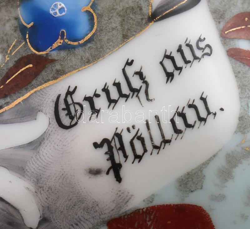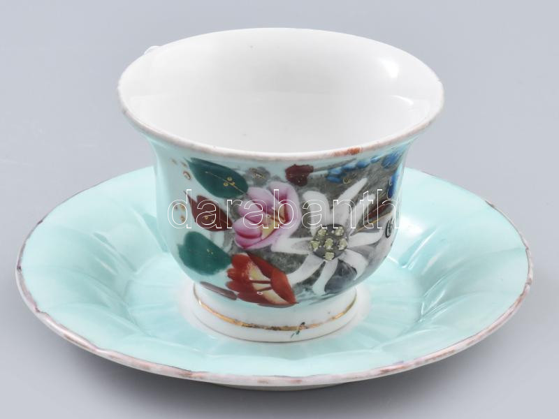 "Gruss aus Pöllau" feliratos, virágmintás osztrák porcelán csésze, hozzá való aljjal. Kézzel festett, jelzett, némi kopással, a csészealj talpán apró lepattanások, d: 9,5 - 15 cm
