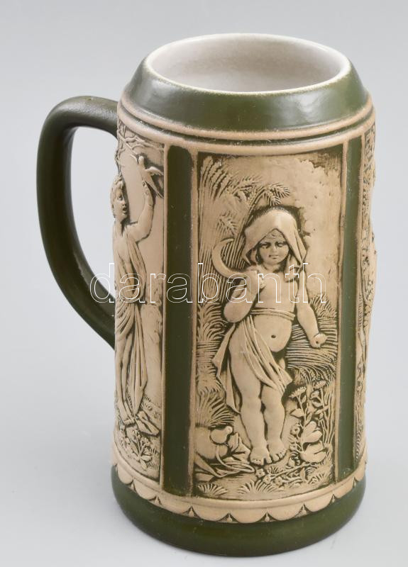 Beschreibung: Original Gerzit gyűjtői söröskorsó, oldalán képtáblákban biszkvit porcelán jelenetek, mohaszínű mázzal egybekötve, jelzéssel, hibátlan, m:18,5 cm