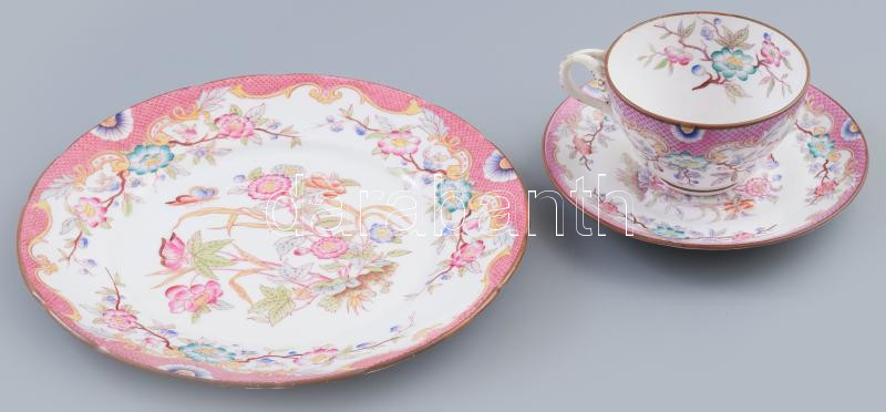 Beschreibung: Sarreguiemines reggeliző szett: csésze, alátét, desszertes tál. 1860-1919 között, kis kopással, d: 21 cm