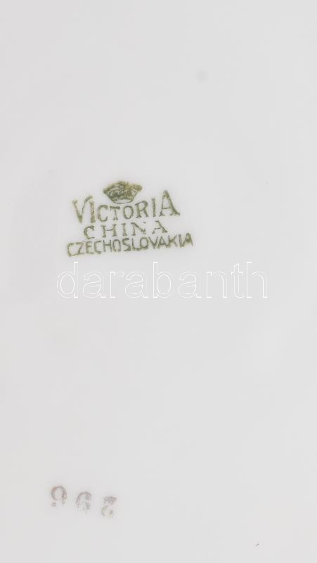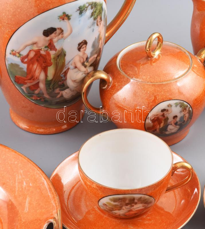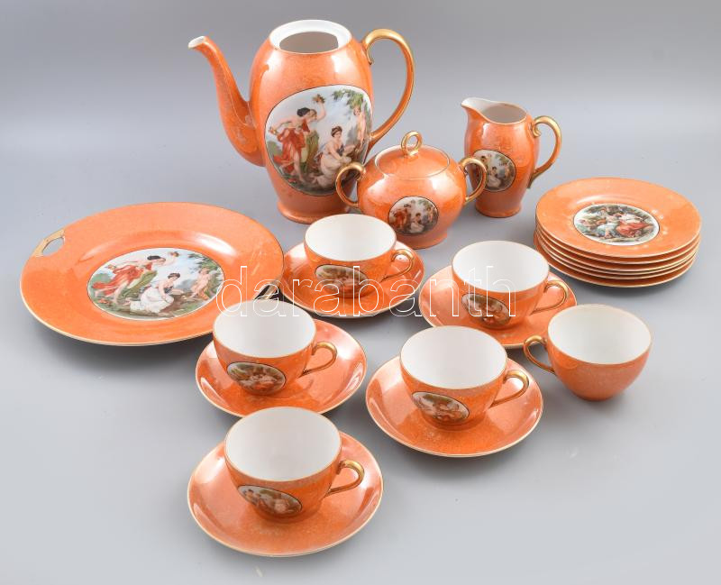 Victoria China historizáló kávés és süteményes készlet. Narancssárga márvány alapon historizáló jelenetekkel. Jelzett, kopással, kávés készletben egy alátét és fedő hiánnyal.