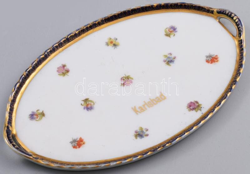 Beschreibung: cca 1900, Karlsbad ékszertartó kistálca, kopással, jelzett, 19x11,5 cm