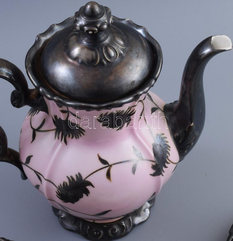 Beschreibung: cca 1920, Mályavszín alapon ezüstözött Bavaria szecessziós kanna és 4 darab csésze alátéttel. Zömmel jelzett, kopással, kanna m: 20,5 cm