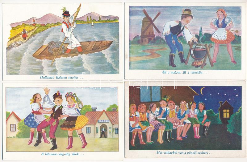 Beschreibung: 4 db RÉGI magyar népviseletes folklór művészlap: nótás grafika, népdalok / 4 pre-1945 Hungarian folklore art postcards: folk songs