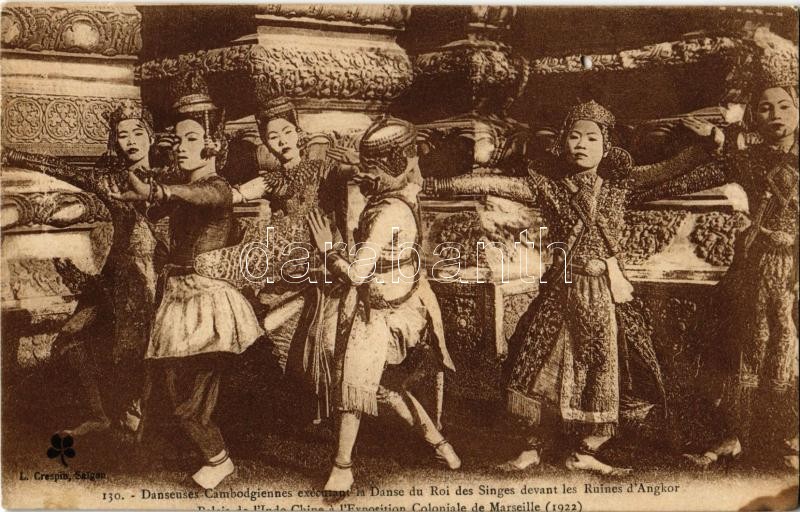 Danseuses Cambodgiennes executant la Danse du Roi des Singes devant les Ruines d'Angkor / Cambodian dancers performing the Dance of the Monkey King in front of the ruins of Angkor, folklore (hole)