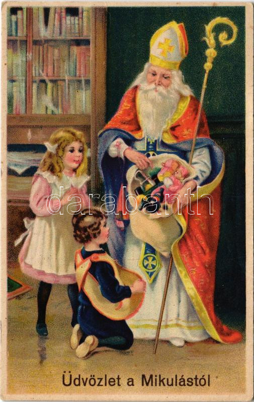 Üdvözlet a Mikulástól / Saint Nicholas greeting, litho https://www.darabanth.com/de/473-Fernauktion/473.0/Ansichtskarten/GruC39Fkarten-Feste~2000057/Udvozlet-a-Mikulastol-Saint-Nicholas-greeting-litho~II3206938
