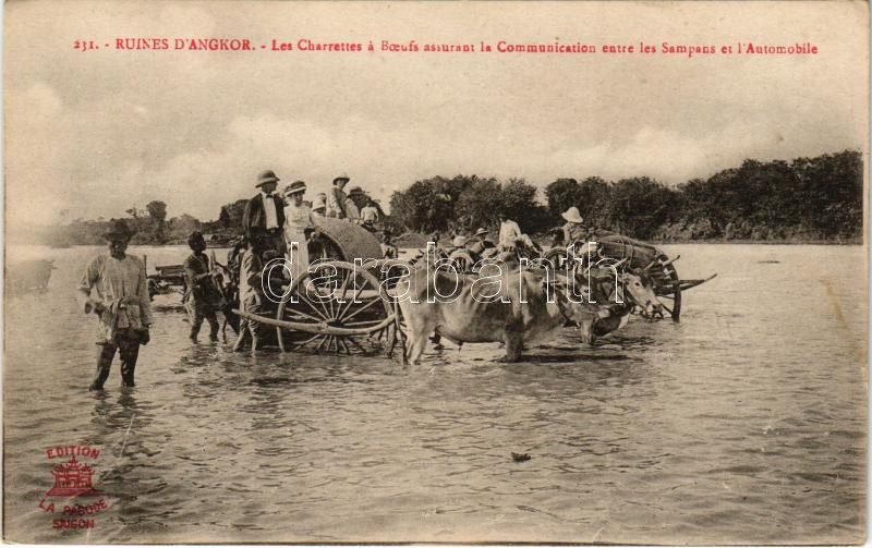 Angkor, Yasodharapura; Les Charrettes a Boeufs assurant la Communication entre les Sampans et l'Automobile / Ökörszekéren szállítják az utasokat a folyóban a sampan hajók és a szárazföldön várakozó autók között / Oxen carts in the river