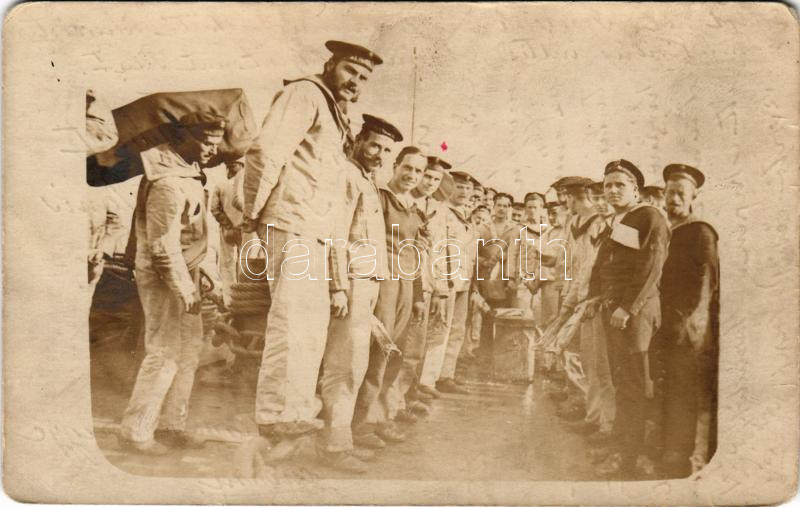 Beschreibung: 1915 SMS Viribus Unitis az Osztrák-Magyar Haditengerészet Tegetthoff-osztályú csatahajó matrózai / K.u.K. Kriegsmarine Matrosen / WWI Austro-Hungarian Navy Tegetthoff-class battleship's mariners. photo + "K.U.K. KRIEGSMARINE SMS VIRIBUS UNITIS" (kopott sarkak / worn corners)