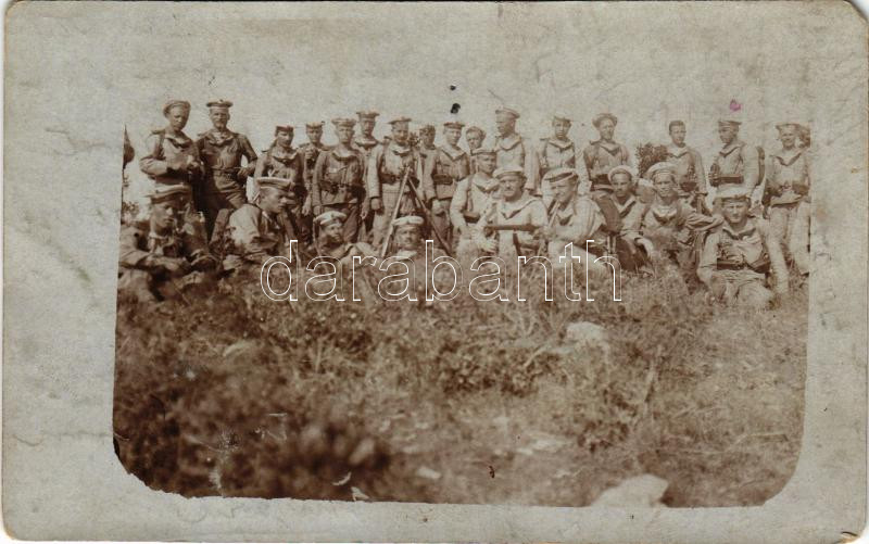 Beschreibung: 1917 SMS Viribus Unitis az Osztrák-Magyar Haditengerészet Tegetthoff-osztályú csatahajó matrózai szárazföldön / K.u.K. Kriegsmarine Matrosen / WWI Austro-Hungarian Navy Tegetthoff-class battleship's mariners on mainland. photo + "K.U.K. KRIEGSMARINE SMS VIRIBUS UNITIS" (EM)