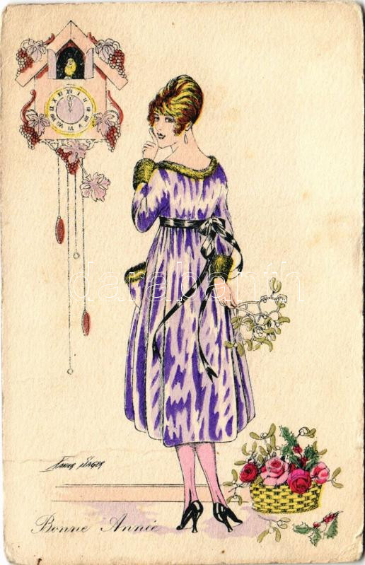 Bonne Année / French lady art postcard with New Year greetings. Fantaisies Parisiennes Aquarelles. Souhaits de Bonheur. Serie No. 21. s: Xavier Sager (fa)
