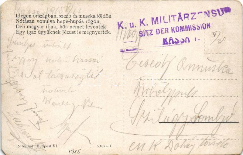 1915 Idegen országban, szerb és muszka földön... "K.u.K. MILITARZENSUR / SITZ DER KOMMISSION: KASSA" cenzúrabélyegzéssel Szilágysomlyóba / WWI K.u.k. and German military, Viribus Unitis (EM)