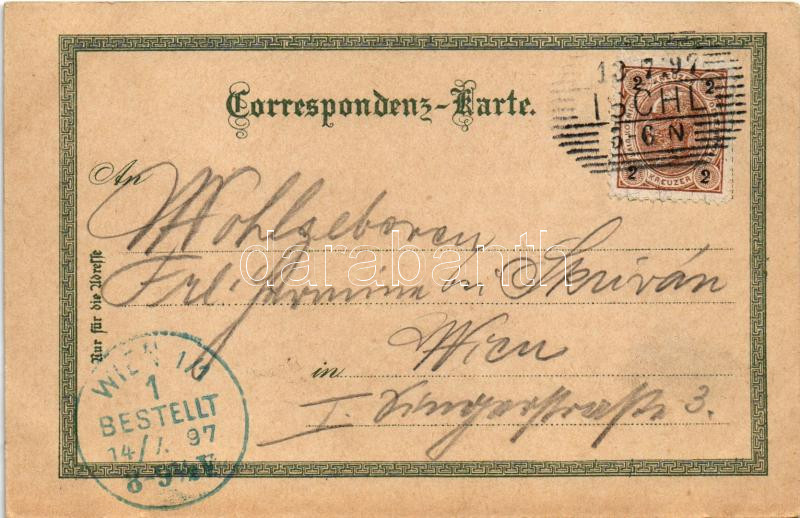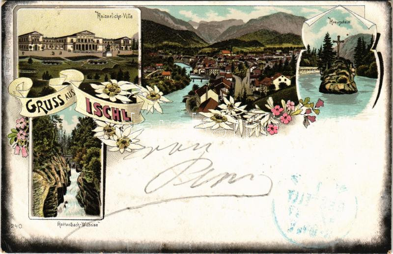 Beschreibung: 1897 (Vorläufer!) Bad Ischl, Kaiserliche Villa, Kreuzstein, Rettenbach-Wildniss / royal castle, villa. Art Nouveau, floral, litho
