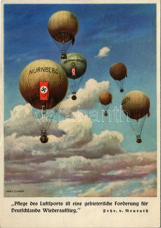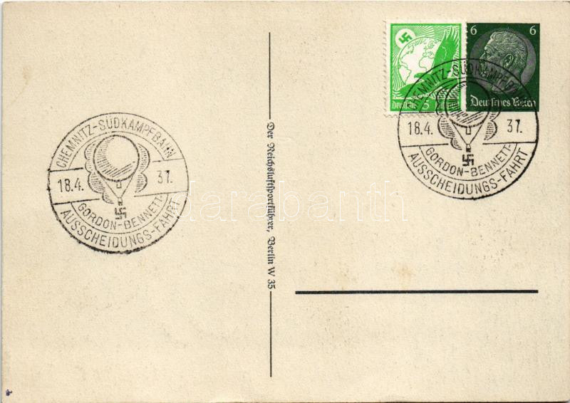 Pflege des Luftsports ist eine gebieterische Forderung für Deutschlands Wiederaufstieg, Frhr. v. Neurath. Der Reichsluftsportführer / German NSDAP Nazi propaganda with balloons + "1937 Chemnitz-Südkampfbahn Gordon-Benett Ausscheidungs-Fahrt" So. Stpl s: Hans Schmidt