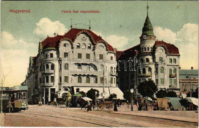 1912 Nagyvárad, Oradea; Fekete Sas szálloda, piac, villamos Ernyei Laj... https://www.darabanth.com/de/473-Fernauktion/473.0/Ansichtskarten/Siebenburgen~2000007/1912-Nagyvarad-Oradea-Fekete-Sas-szalloda-piac-villamos-Ernyei-Lajos-uzlete-Magyar-bank-Ben~II2988868