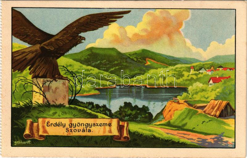 Beschreibung: Szováta, Szovátafürdő, Sovata; "Erdély gyöngyszeme Szováta" Kiadja a Székely Egyetemi és Főiskolai Hallgatók Egyesülete / Hungarian irredenta art postcard s: Gebhardt (képeslapfüzetből / from postcard booklet)