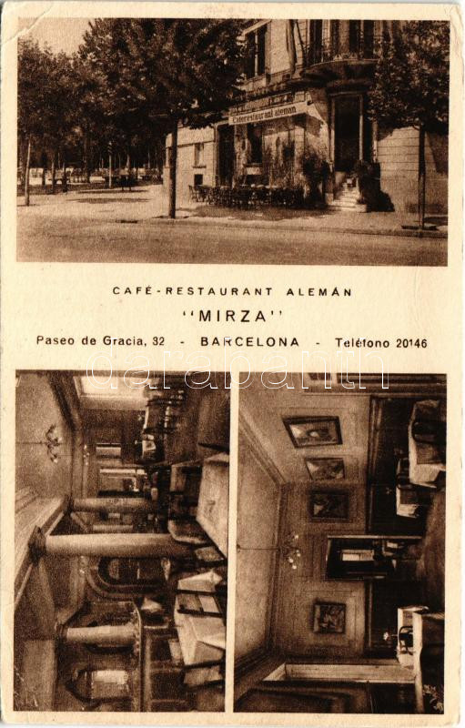 1938 Barcelona, Café Restaurant Alemán "Mirza" (EB) https://www.darabanth.com/de/473-Fernauktion/473.0/Ansichtskarten/Spanien~2000112/1938-Barcelona-Cafe-Restaurant-Aleman-Mirza-EB~II3206061