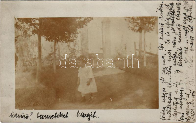 Beschreibung: 1913 Baja, ház udvara gyerekkel. Dr. Lévai József főorvos úrnak címezve. photo