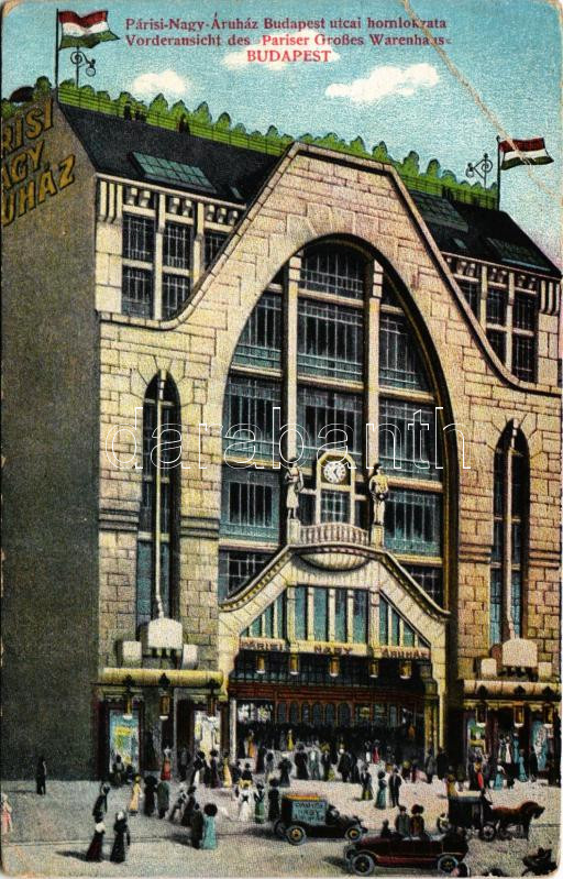 Beschreibung: 1914 Budapest VI. Párisi Nagy Áruház utcai homlokzata, reklám (EB)